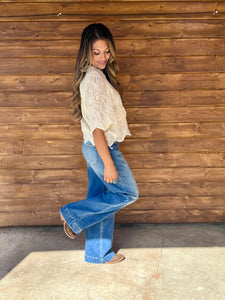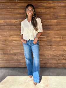 Featuring a scalloped hem, floral eyelet details, and front pockets for a touch of charm, this top brings classic Southern elegance with a modern twist. The lightweight fabric and soft ivory hue make it perfect for fall days, date nights, or dressing up your favorite denim.