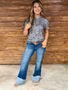 Featuring hand-drawn inspired sketches of boots, horses, ropes, and hats, this soft gray tee brings all the rustic charm you love in a comfy, relaxed fit. Whether you’re headed to the rodeo, running errands, or soaking up a slow Sunday on the ranch, this top keeps you cute and comfy all day long.